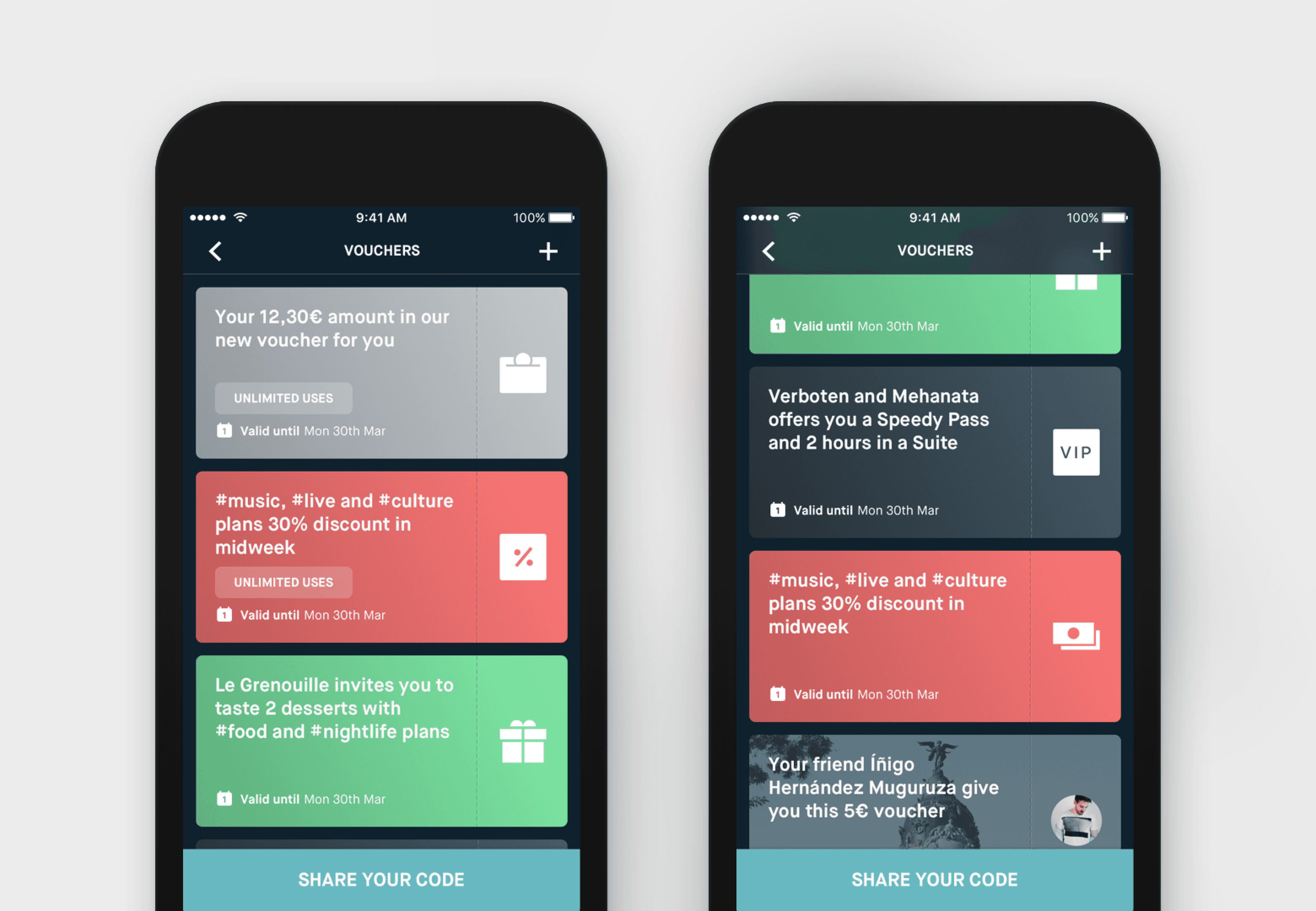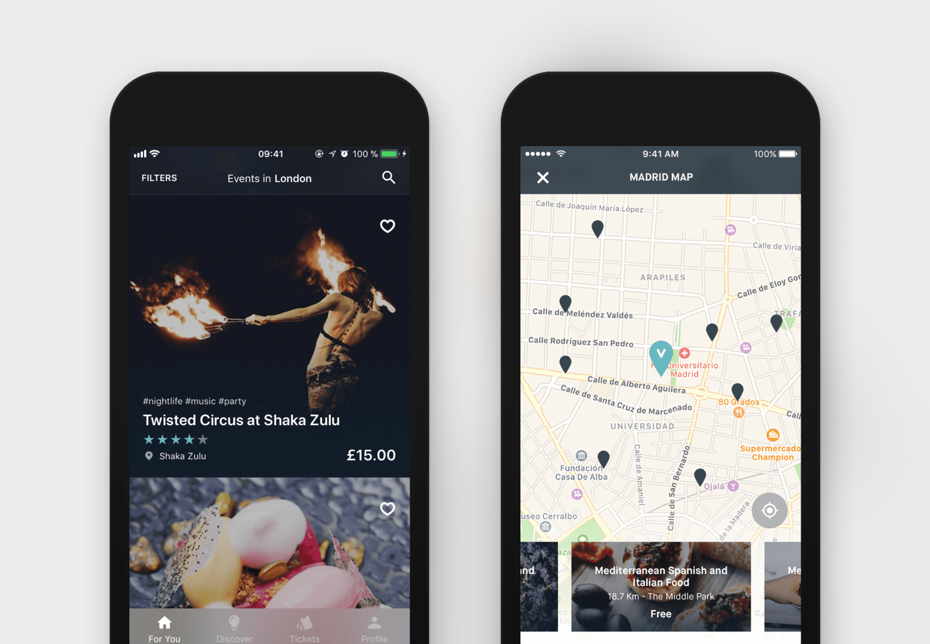 Between 2015 and 2017 I was part of a small cross-functional team in the role of Product Designer, working mainly on the redesign of the apps. I also led the discoveries and implementations of the navigation to find social events, the purchase process and the event management tools.